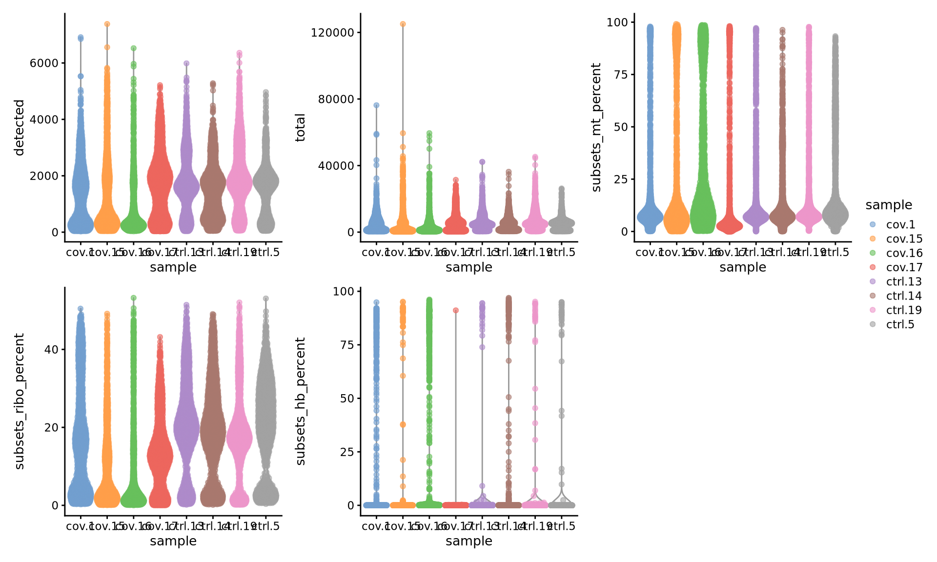 Having the data in a suitable format, we can start calculating some quality metrics. We can for example calculate the percentage of mitochondrial and ribosomal genes per cell and add to the metadata. The proportion of hemoglobin genes can give an indication of red blood cell contamination, but in some tissues it can also be the case that some celltypes have higher content of hemoglobin. This will be helpful to visualize them across different metadata parameters (i.e. datasetID and chemistry version). There are several ways of doing this. The QC metrics are finally added to the metadata table.