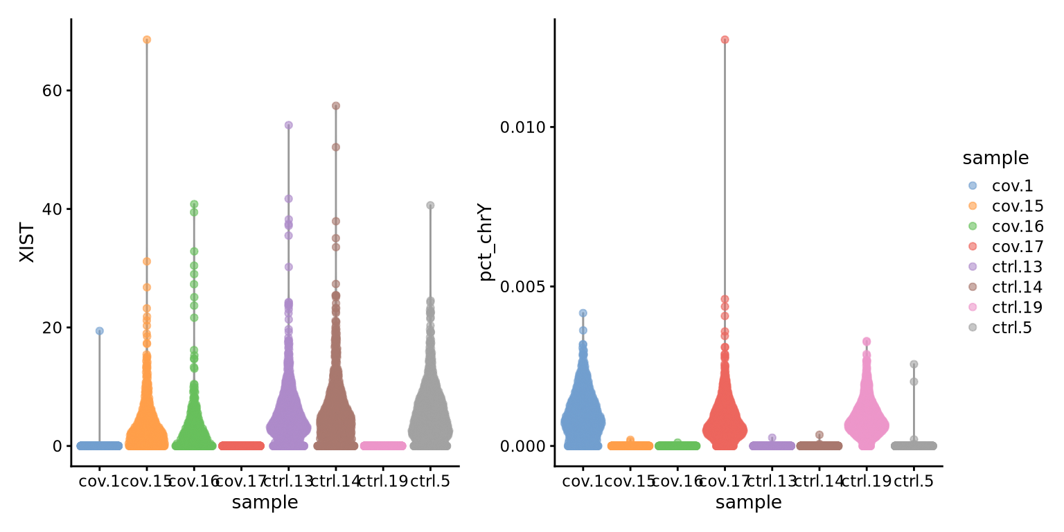 sce@colData$type <- ifelse(grepl("cov", sce@colData$sample), "Covid", "Control")Once you have created the merged Seurat object, the count matrices and individual count matrices and objects are not needed anymore. It is a good idea to remove them and run garbage collect to free up some memory.