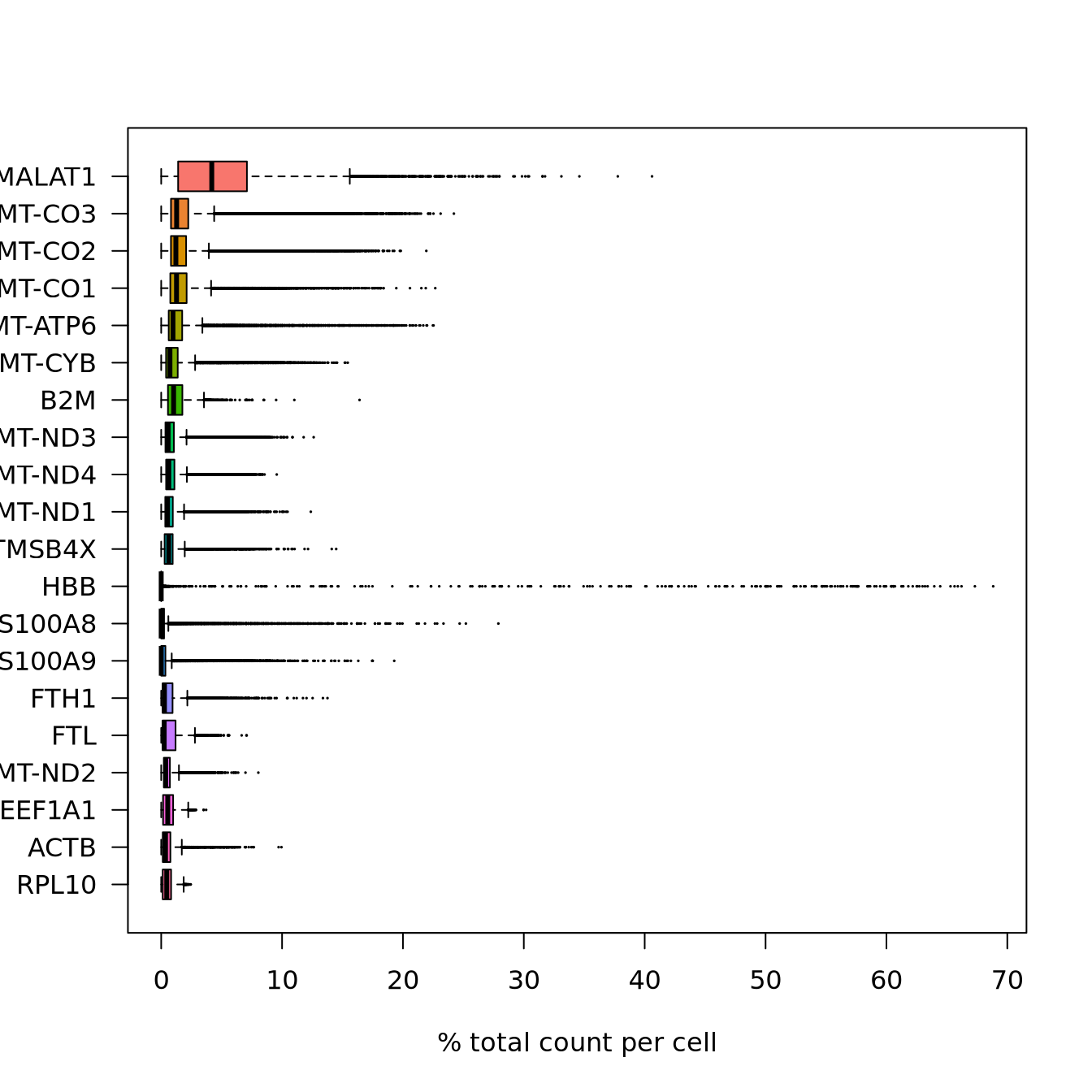 hb_genes <- rownames(sce)[grep("^HB[^(P|E|S)]", rownames(sce))]First, let Scran calculate some general qc-stats for genes and cells with the function perCellQCMetrics. It can also calculate proportion of counts for specific gene subsets, so first we need to define which genes are mitochondrial, ribosomal and hemoglobin.