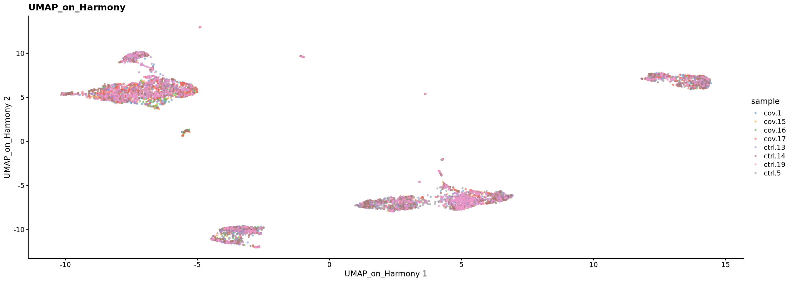 p3 <- plotReducedDim(sce, dimred = "UMAP_on_Harmony", colour_by = "sample", point_size = 0.6) + ggplot2::ggtitle(label = "UMAP_on_Harmony")