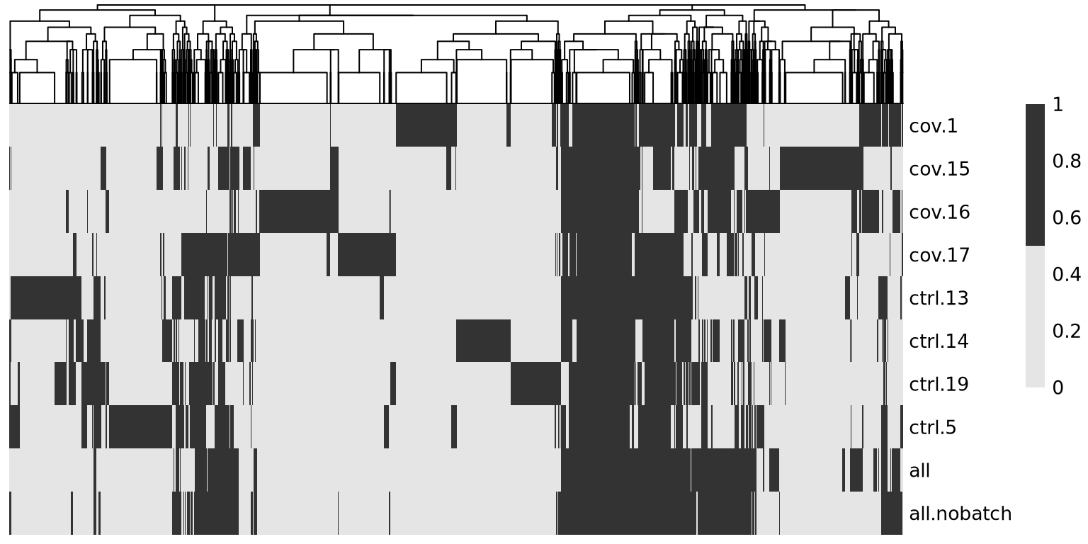 })As you can see, there are a lot of genes that are variable in just one dataset. There are also some genes in the gene set that was selected using all the data without blocking samples, that are not variable in any of the individual datasets. These are most likely genes driven by batch effects.