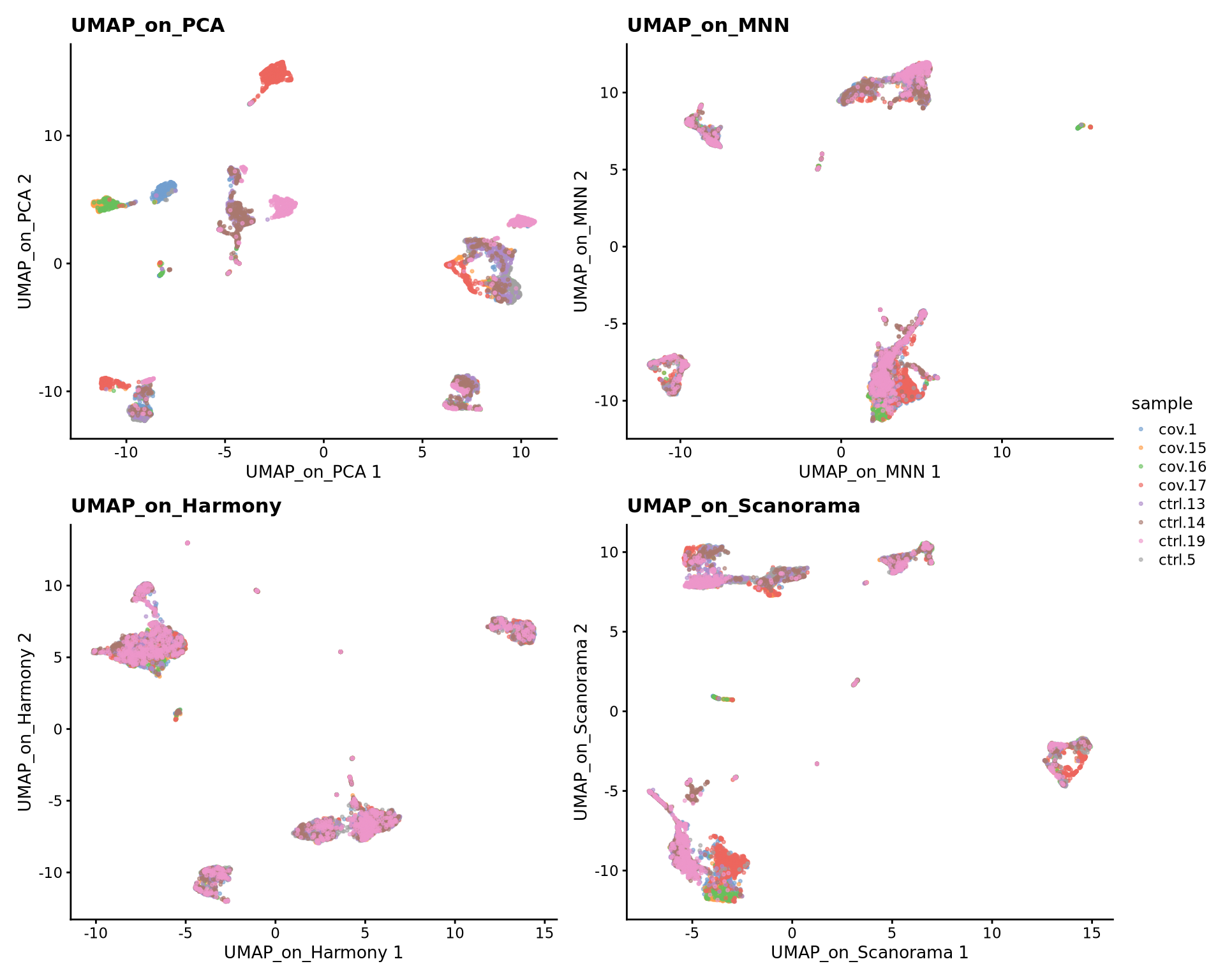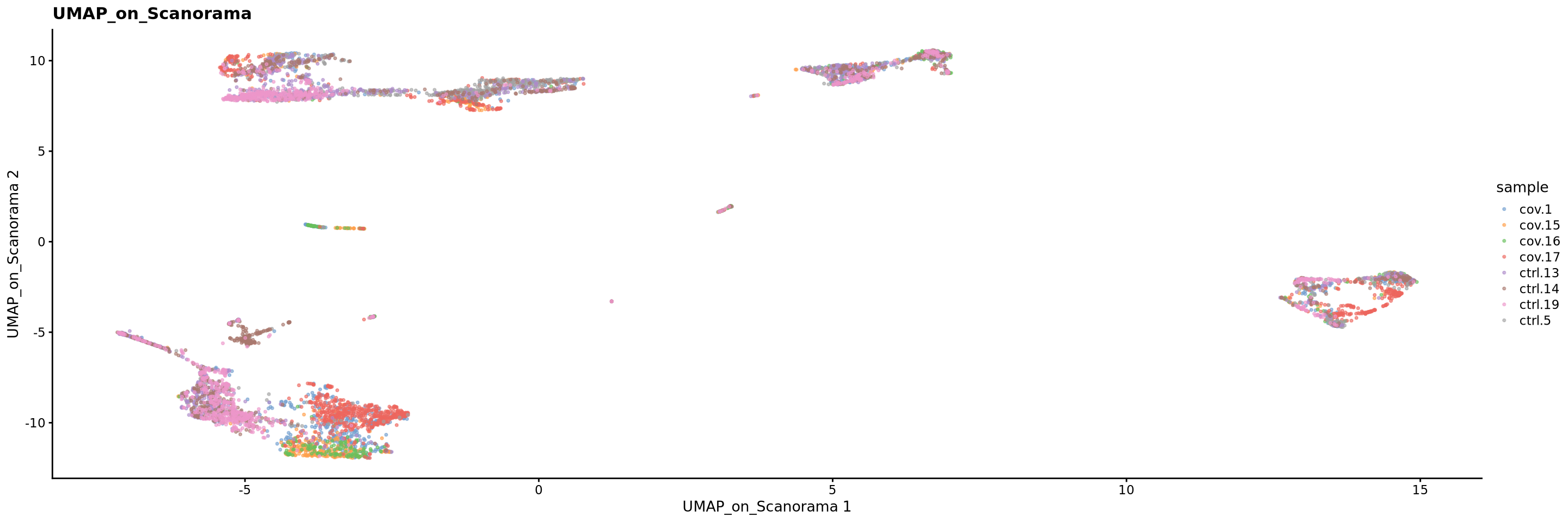 sce <- runUMAP(sce, dimred = "Scanorama", n_dimred = 50, ncomponents = 2, name = "UMAP_on_Scanorama")