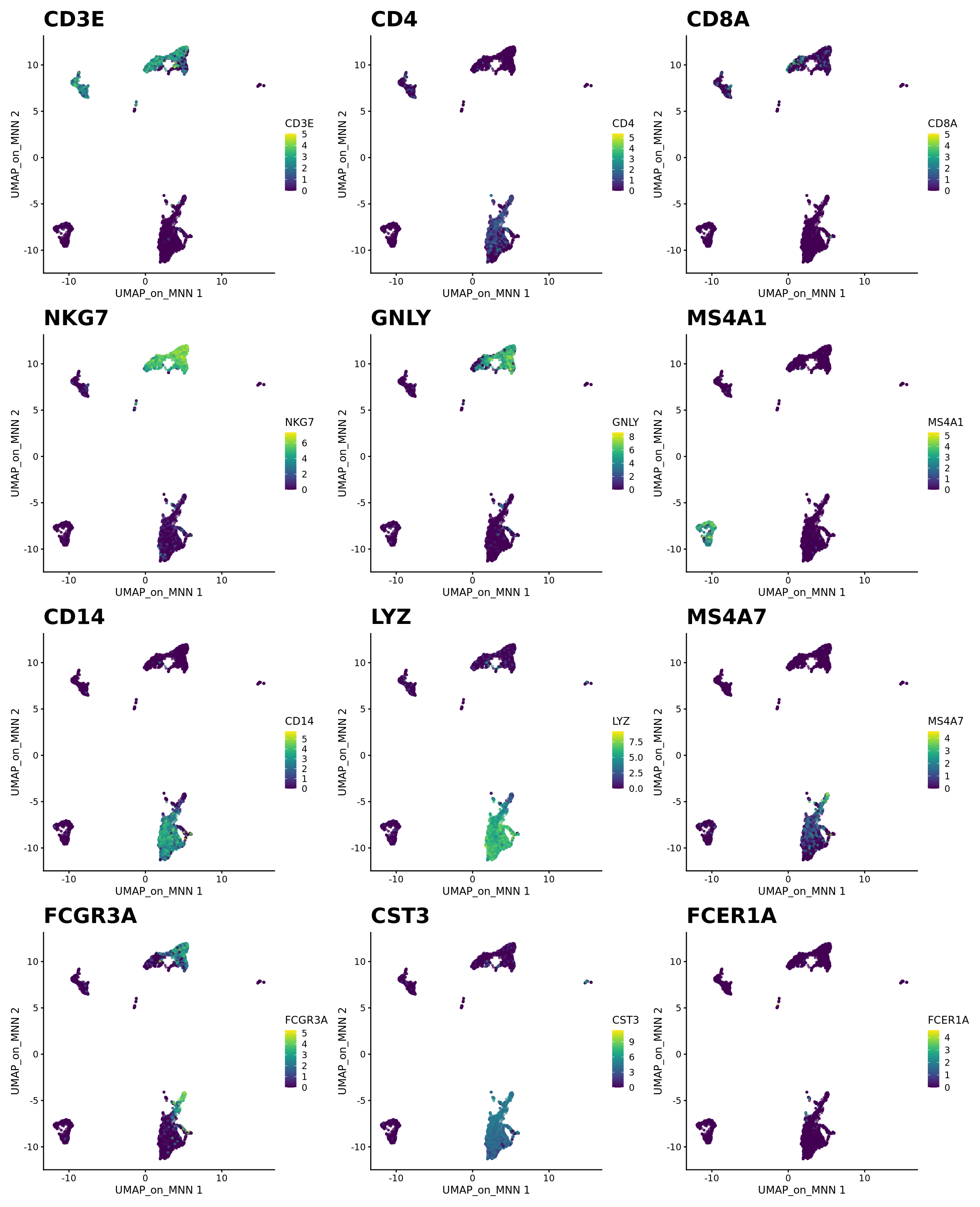 for (i in c("CD3E", "CD4", "CD8A", "NKG7", "GNLY", "MS4A1", "CD14", "LYZ", "MS4A7", "FCGR3A", "CST3", "FCER1A")) {