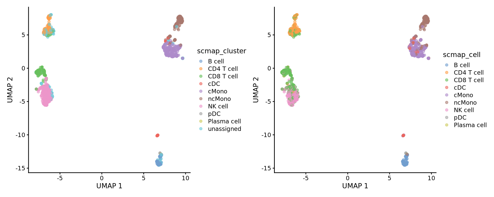 For scmap cell type labels must be stored in the cell_type1 column of the colData slots, and gene ids that are consistent across both datasets must be stored in the feature_symbol column of the rowData slots.
