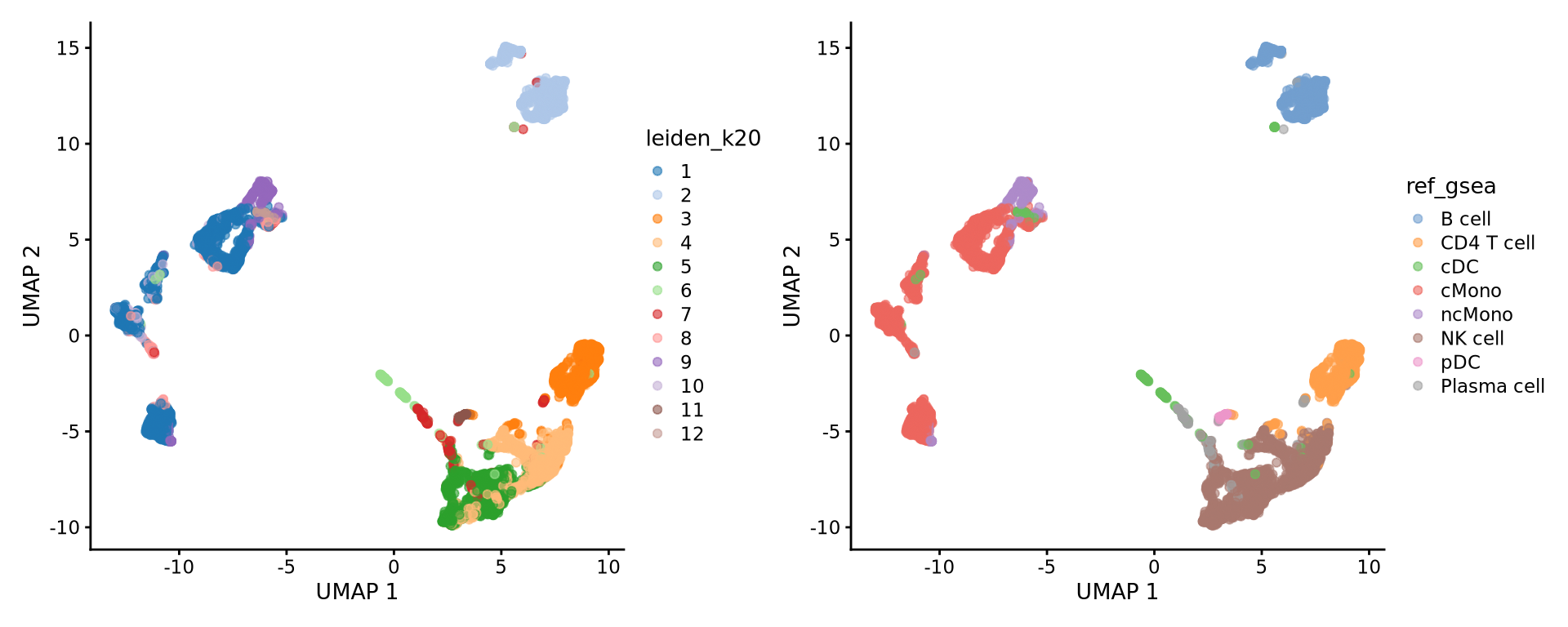ref.sce <- runUMAP(ref.sce, dimred = "PCA")Run all steps of the analysis for the ctrl sample as well. Use the clustering from the integration lab with resolution 0.5.