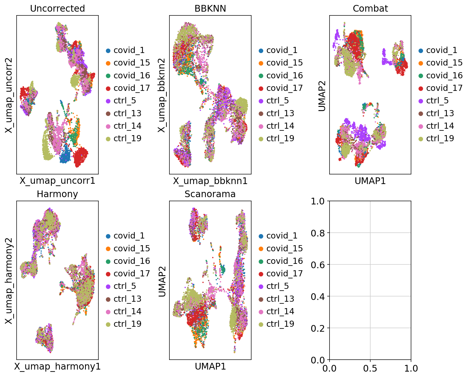 sc.pl.umap(adata, color="sample", title="Scanorama", ax=axs[1,1], show=False)<Axes: title={'center': 'Scanorama'}, xlabel='UMAP1', ylabel='UMAP2'>