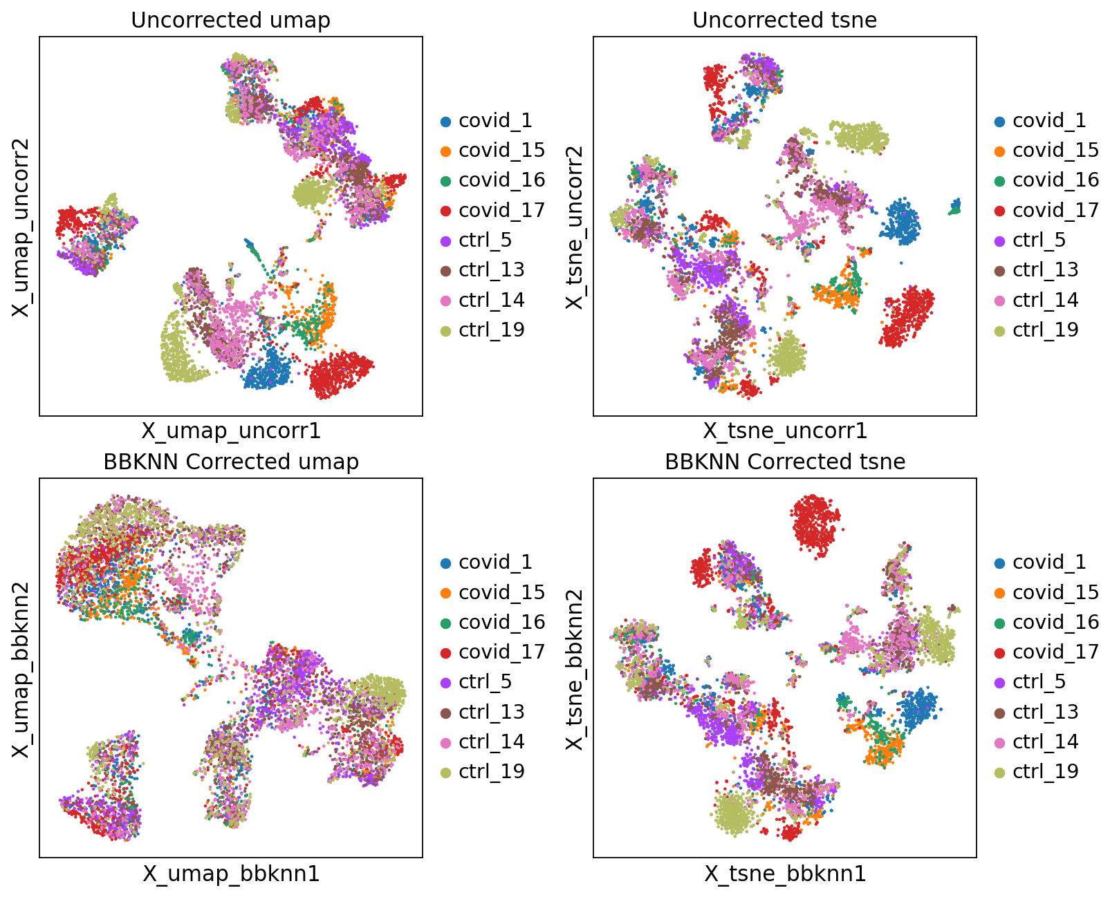sc.pl.embedding(adata, 'X_umap_uncorr', color="sample", title="Uncorrected", ax=axs[0,0], show=False)