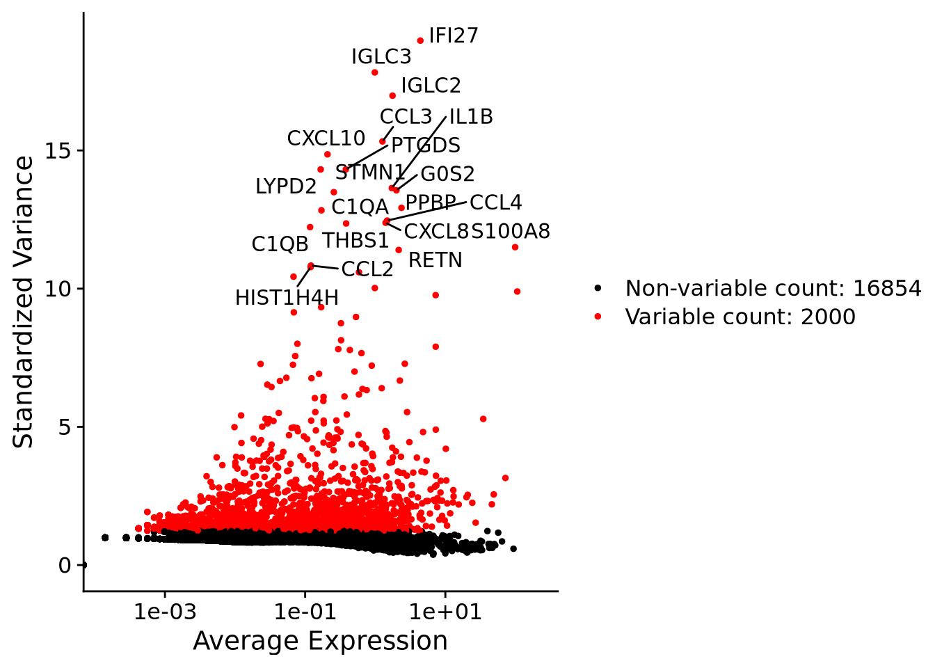 We first need to define which features/genes are important in our dataset to distinguish cell types. For this purpose, we need to find genes that are highly variable across cells, which in turn will also provide a good separation of the cell clusters.