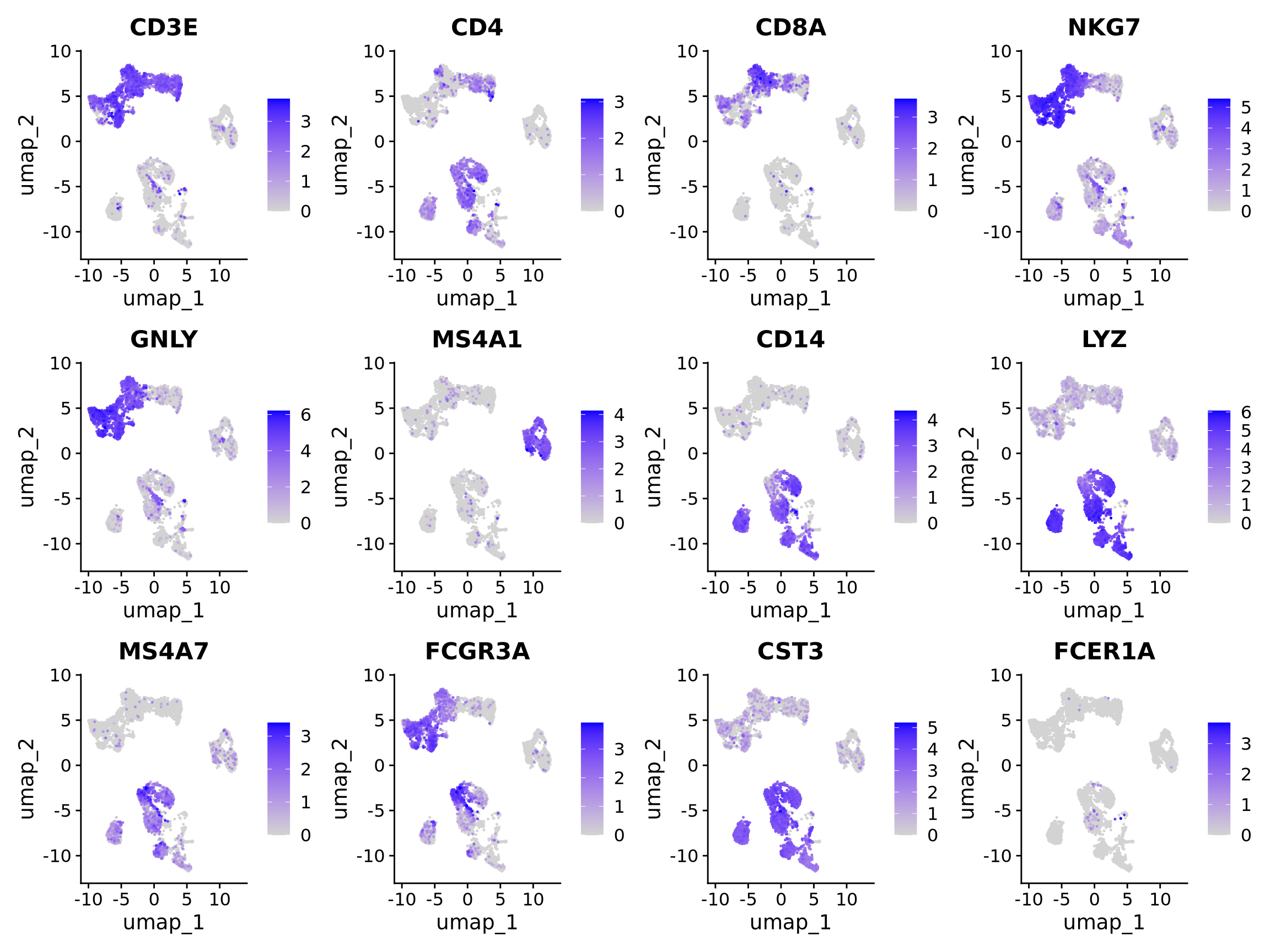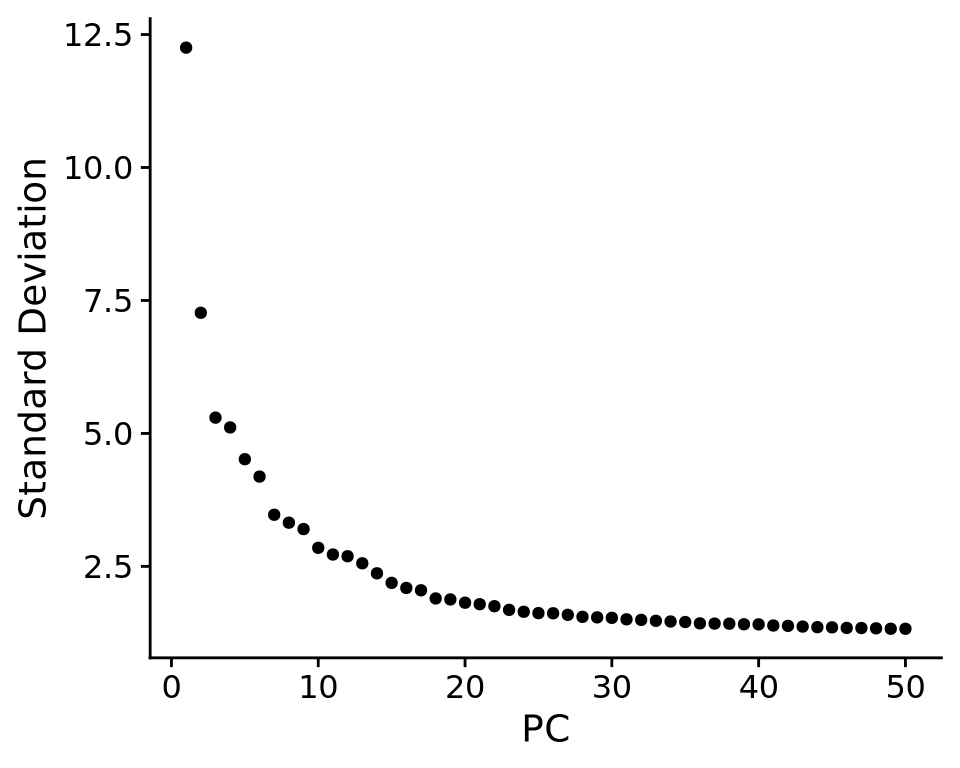 Based on this plot, we can see that the top 8 PCs retain a lot of information, while other PCs contain progressively less. However, it is still advisable to use more PCs since they might contain information about rare cell types (such as platelets and DCs in this dataset)