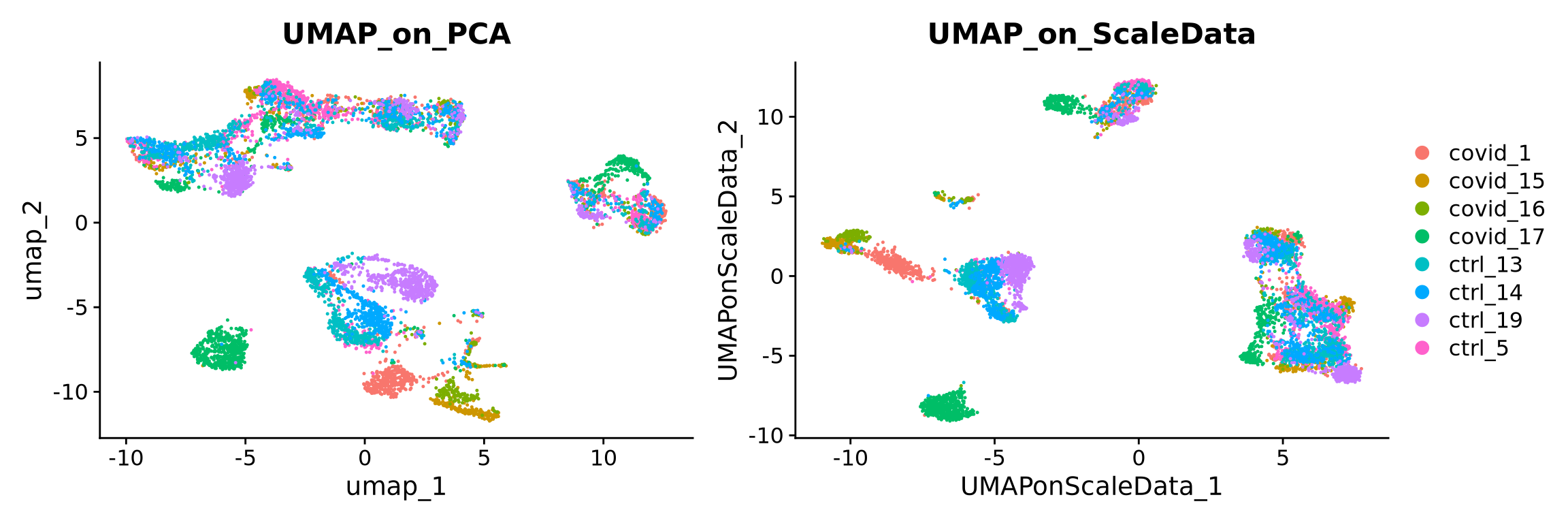 p2 <- DimPlot(alldata, reduction = "UMAP_on_ScaleData", group.by = "orig.ident") + ggplot2::ggtitle(label = "UMAP_on_ScaleData")
