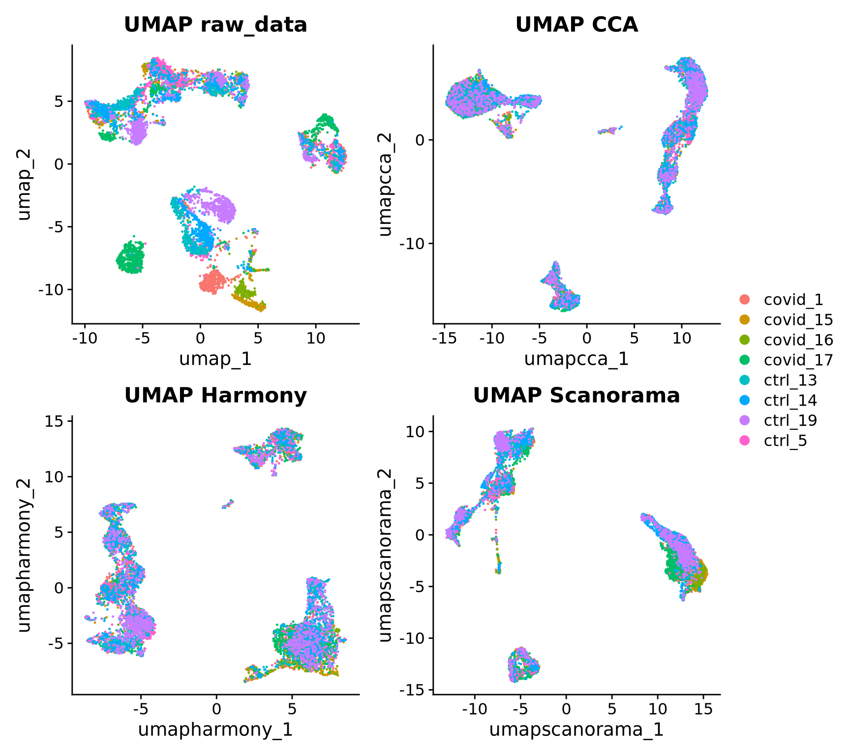p4 <- DimPlot(alldata, reduction = "umap_scanorama", group.by = "orig.ident")+ggtitle("UMAP Scanorama")