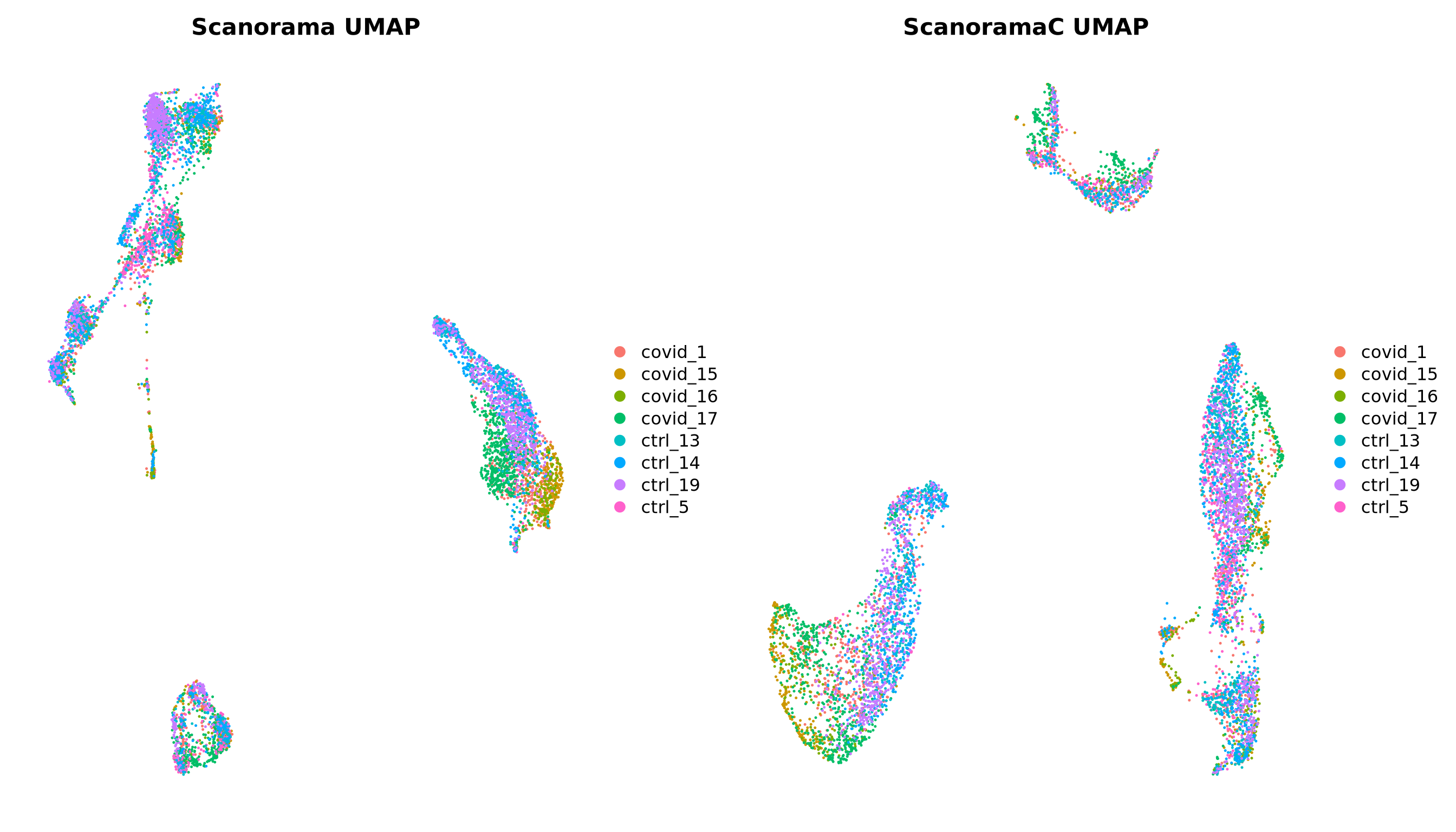 p2 = DimPlot(alldata, reduction = "umap_scanoramaC", group.by = "orig.ident") + NoAxes() + ggtitle("ScanoramaC UMAP")