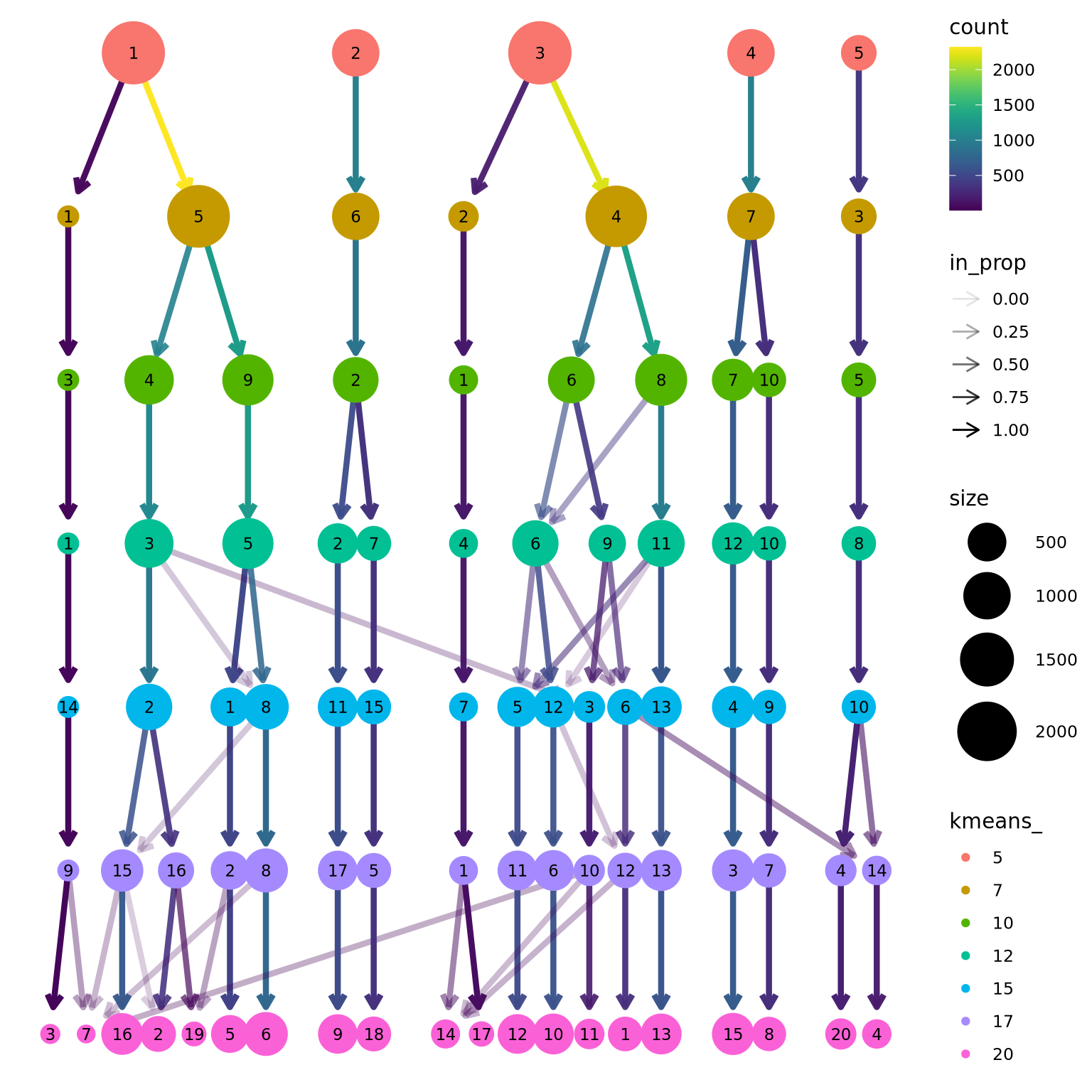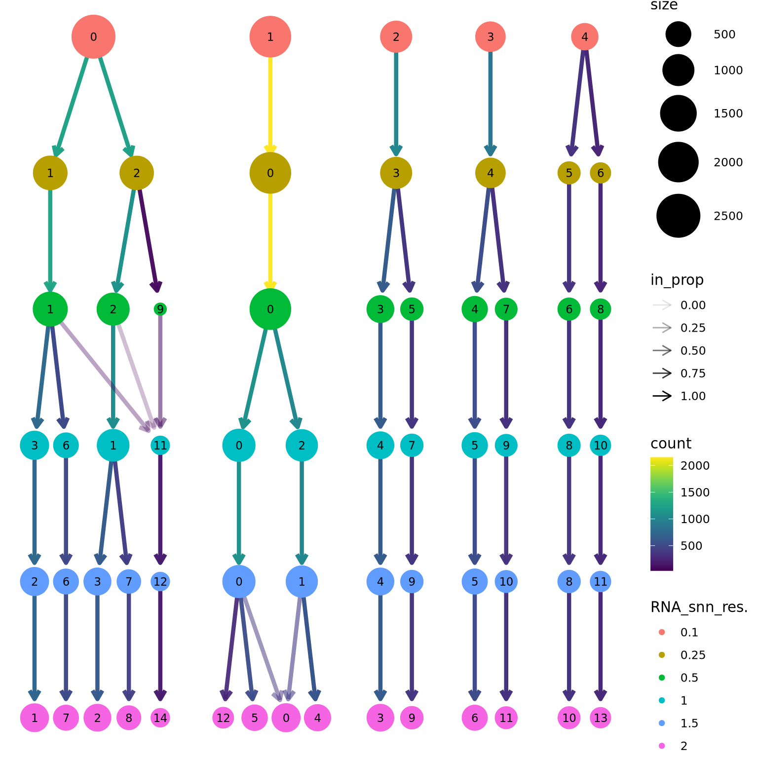 )We can now use the clustree package to visualize how cells are distributed between clusters depending on resolution.