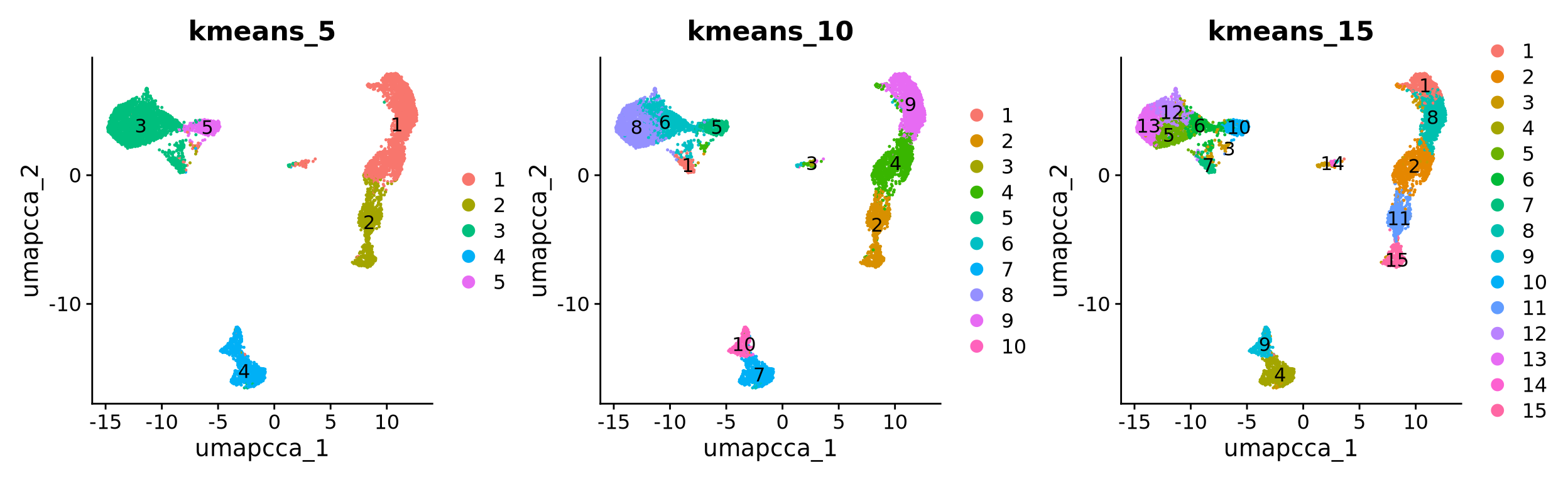 alldata@meta.data[, paste0("kmeans_", k)] <- kmeans(x = Embeddings(alldata, "integrated_cca"), centers = k, nstart = 100)$cluster