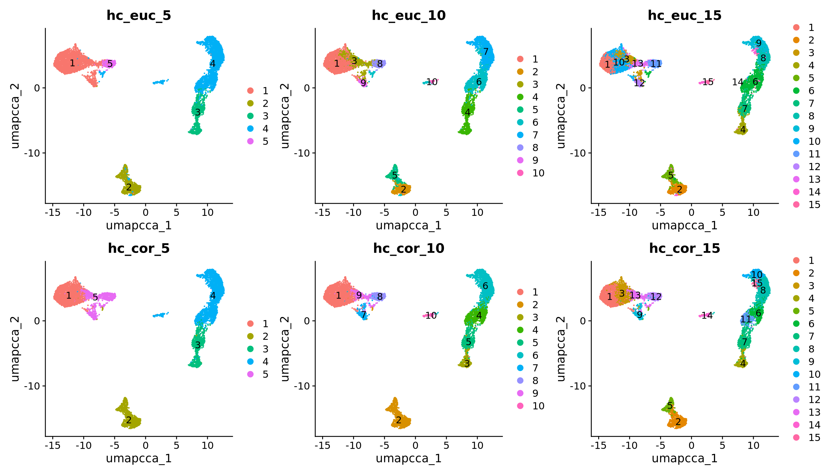 DimPlot(alldata, reduction = "umap_cca", group.by = "hc_euclidean_10", label=T) + ggtitle("hc_euc_10"),