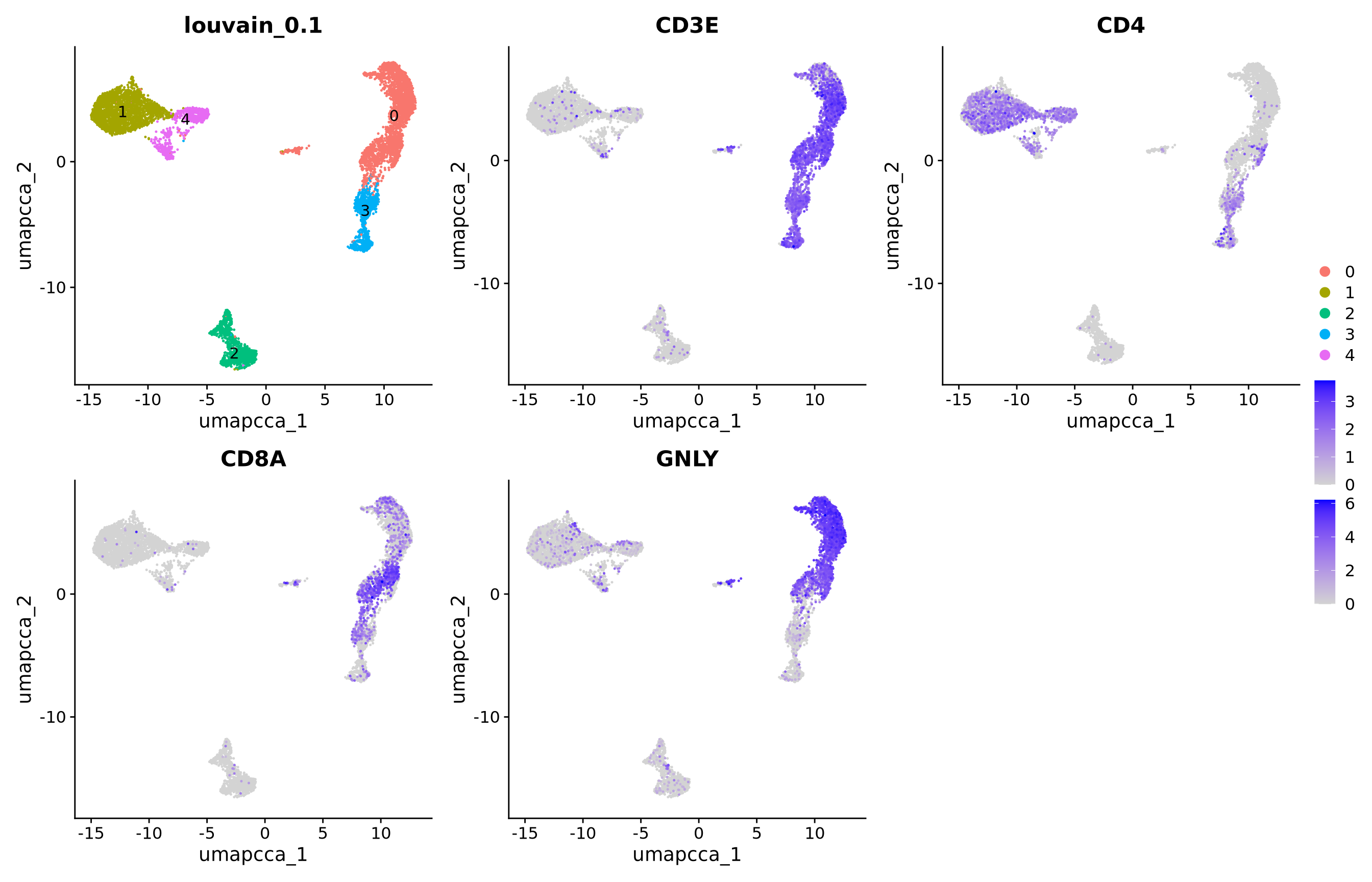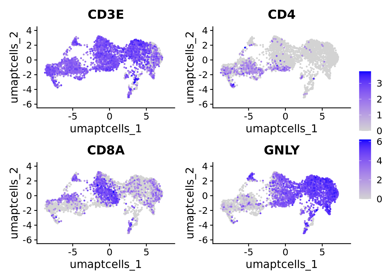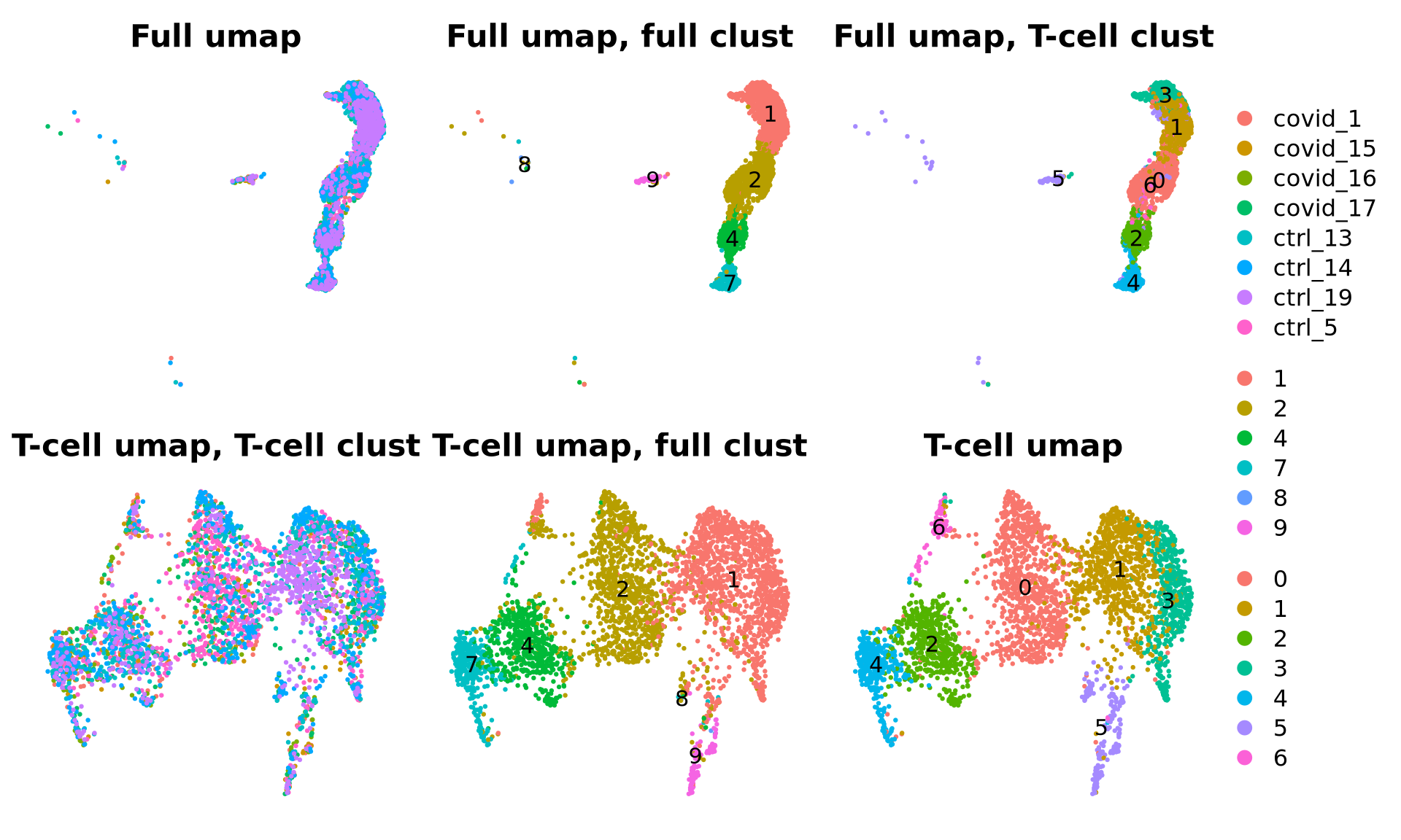 ) + plot_layout(guides = "collect")Have a look at the T-cells in the umaps with all cells or only T/NK cells. What are the main differences? Do you think it improved with subclustering? Also, there are some cells in these clusters that fall far away from the rest in the UMAPs, why do you think that is?