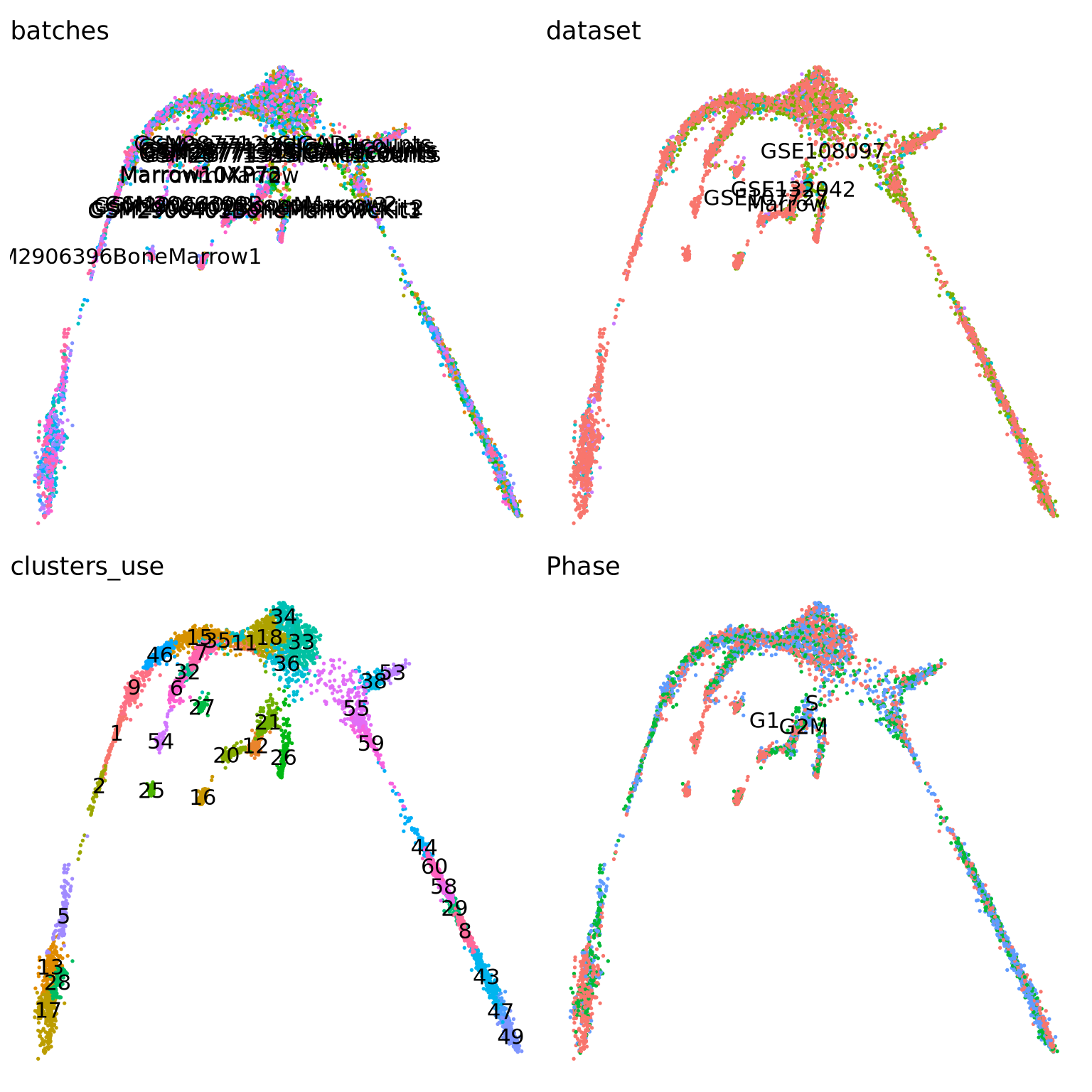 vars <- c("batches", "dataset", "clusters_use", "Phase")