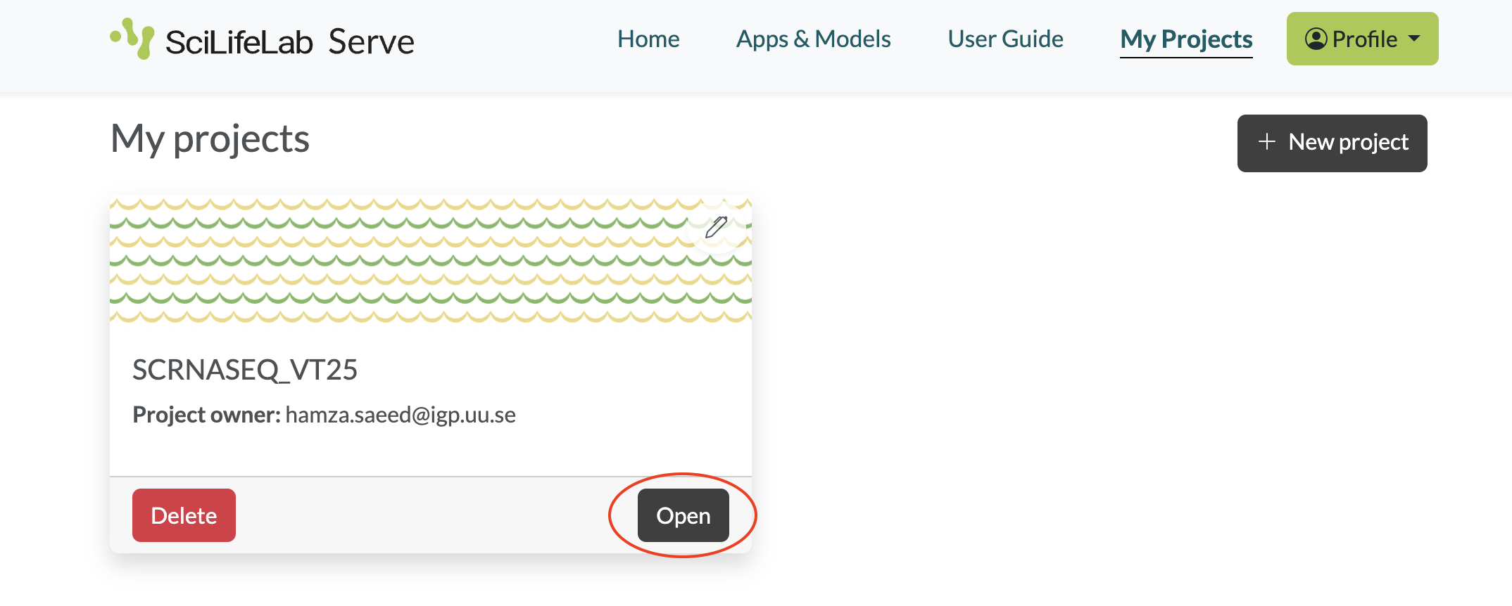 - Select My projects from the main menu. You should see a project called SCRNASEQ_VT25. Click Open.